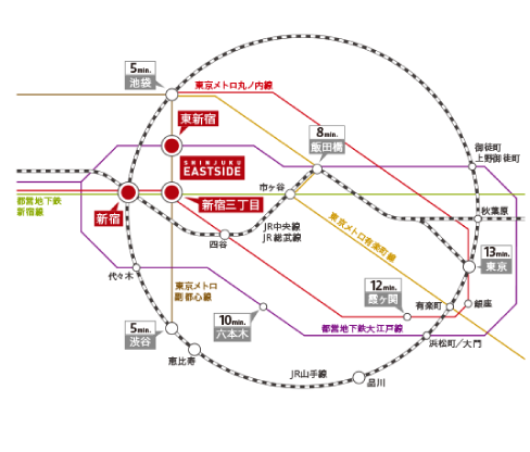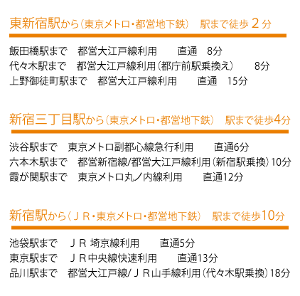 ACCESS アクセス 各方面とダイレクトにつながり、スマートな日々を実現 新宿から多彩な主要拠点へ優れたアクセス 都営大江戸線 『東新宿』駅 まで 徒歩 5分 副都心線 『新宿三丁目』駅まで 徒歩 5分 東京メトロ丸ノ内線 『新宿』駅まで 徒歩 11分 都営新宿線 『新宿三丁目』駅まで 徒歩 4分 多彩な交通手段で主要拠点へとダイレクトアクセスが可能 TRAIN 「新宿三丁目駅」から徒歩4分丸の内線・副都心線・都営新宿線が利用可能 ※電車による所用時間は日中平常時のもので、曜日・時間帯によって多少異なり、乗り換え、待ち時間は含みません。 TAXI ※タクシー料金は「タクシーサイト」料金検索にて算出したもので、走行ルートや交通事情によって料金が異なります。また、高速・深夜料金は含まれておりません。※掲載の所要時間は、「タクシーサイト」料金検索の記載情報です。地図上の概測距離を時速40kmで算出する方法とは異なりますので、予めご了承下さい。 BUS バス停までは徒歩1分 近隣バス停・日清食品前・東新宿駅前 ・区民健康センター MY CAR 自由自在のマルチアクセスで広がる利便性 首都高速道路4号新宿線 外苑出入口まで約2.5Km 都心の様々な街へダイレクトアクセス日々の暮らしをさらに彩ります 伊勢丹新宿店本館 (約596m) 新宿御苑(約956m) マルエツ 新宿六丁目店(約130m) 東京医科大学病院(約1.650m) 新宿アルタ (約898m) 新宿中央公園(約1.970m) 新宿区役所(約587m) 東京新宿鎮座 花園神社(約382m) COMFORIA SHINJUKUEASTSIDE TOWER 所在地〒160-0022 東京都新宿区新宿6-27-29コンフォリア新宿イーストサイドタワー 空室情報はこちら お問い合わせはこちら